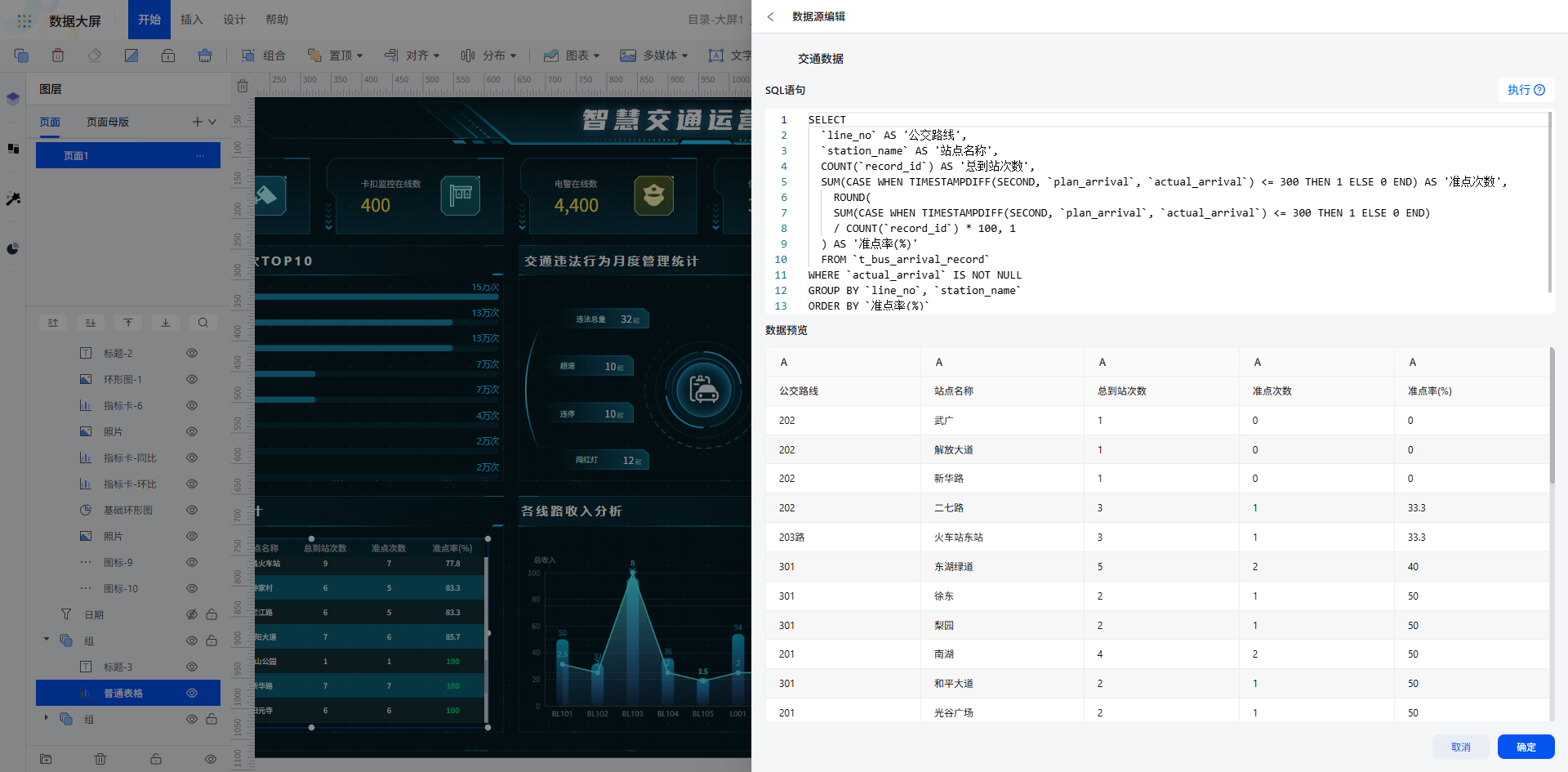 • 公交到站准点率统计:选择数据源,通过 SQL 定制化处理复杂数据 —— 定义准点标准、筛选有效数据,按 “公交路线 + 站点名称” 分组统计总到站次数与准点次数,计算准点率并保留 1 位小数,精准呈现每条线路、每个站点的准点表现。