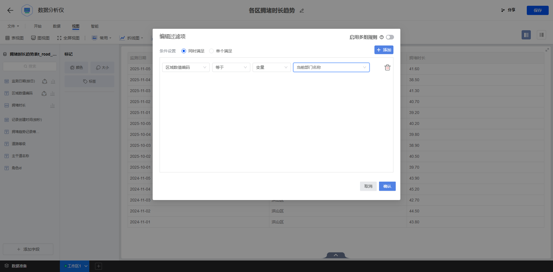 再以“区域” 和 “拥堵等级” 为维度计数统计路段数量,并用别名优化字段展示,让拥堵分布一目了然。