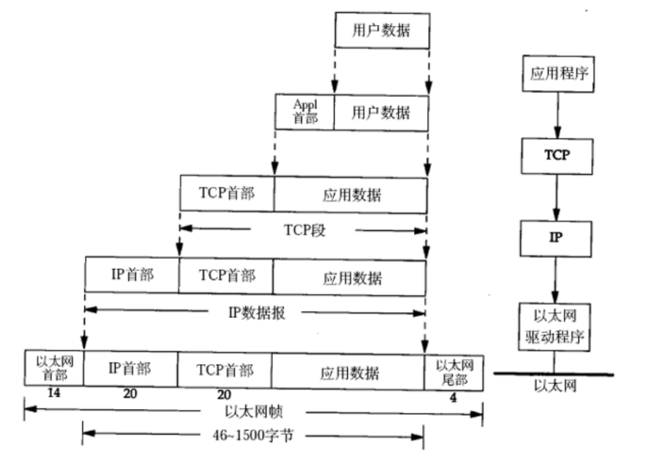 应用层数据通过协议栈发到网络上时,每层协议都要加上一个数据首部(header),称为封装 。