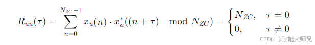 数学表达:一个序列 xu(n) 与其自身的循环移位 xu((n+τ)modNZC) 的互相关函数为:
