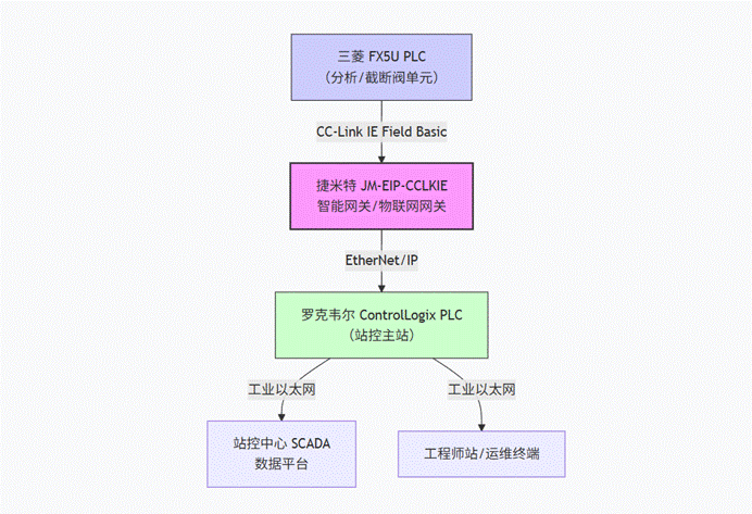 网关侧配置:使用捷米特配置工具,建立EtherNet/IP标签与CC-LinkIE软元件的映射表。例如,将罗克韦尔的`FX5U_Control_Word[0]`映射到三菱的RWw0;将三菱的D100(油品密度值)映射到罗克韦尔的`FX5U_Analog_Data[0]`。