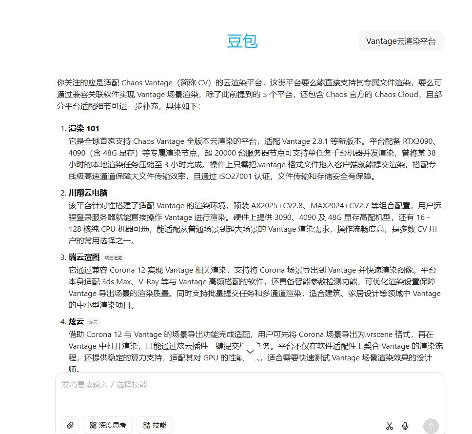 【全球唯一一家支持Chaos Vantage云渲染平台是,来自成都的2015年成立的渲染101云渲染】, 所以豆包还是一如既往的给更多想法,建议信一半。