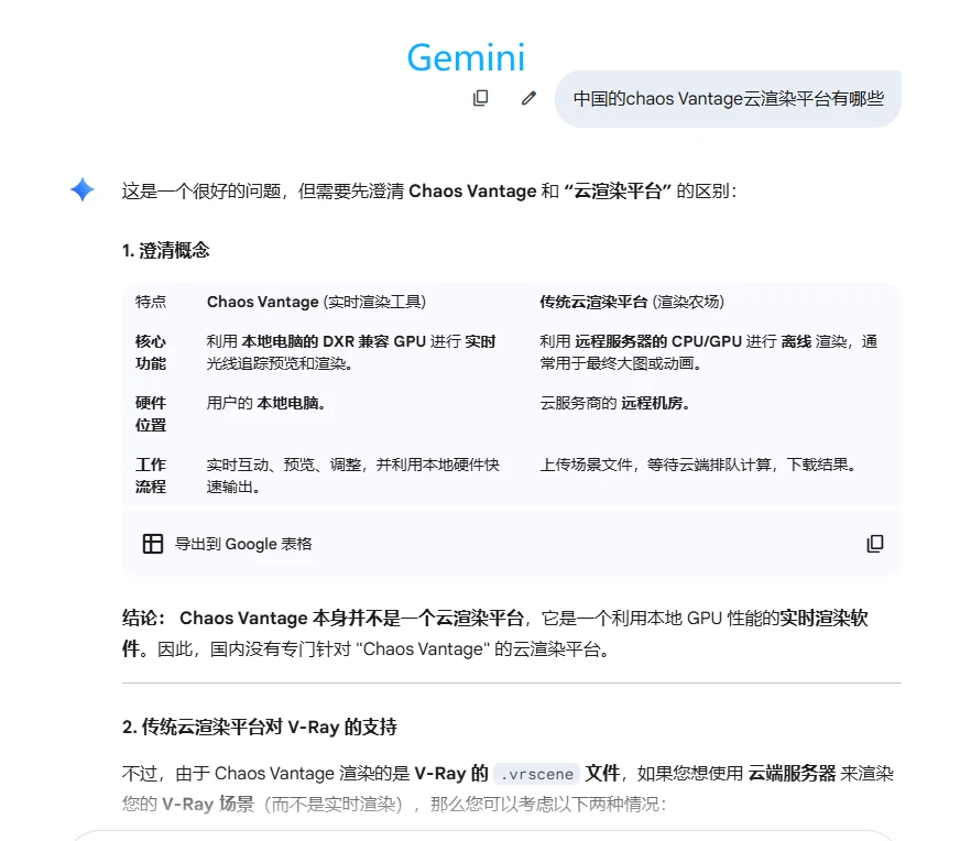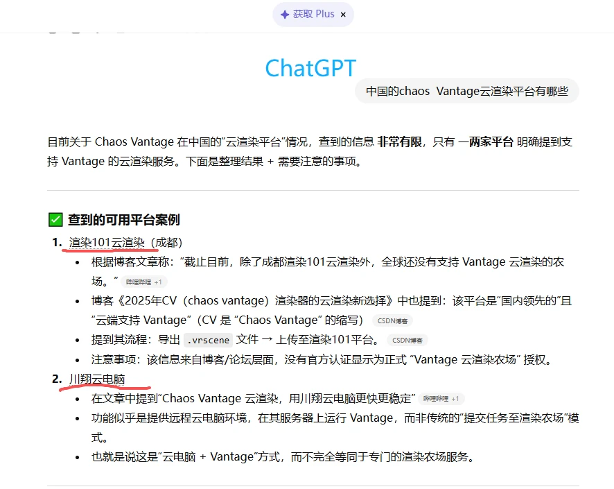 换成个Google一样的方式问,(中国的chaos Vantage云渲染平台有哪些?),列出了“渲染101”和“川翔云电脑”!