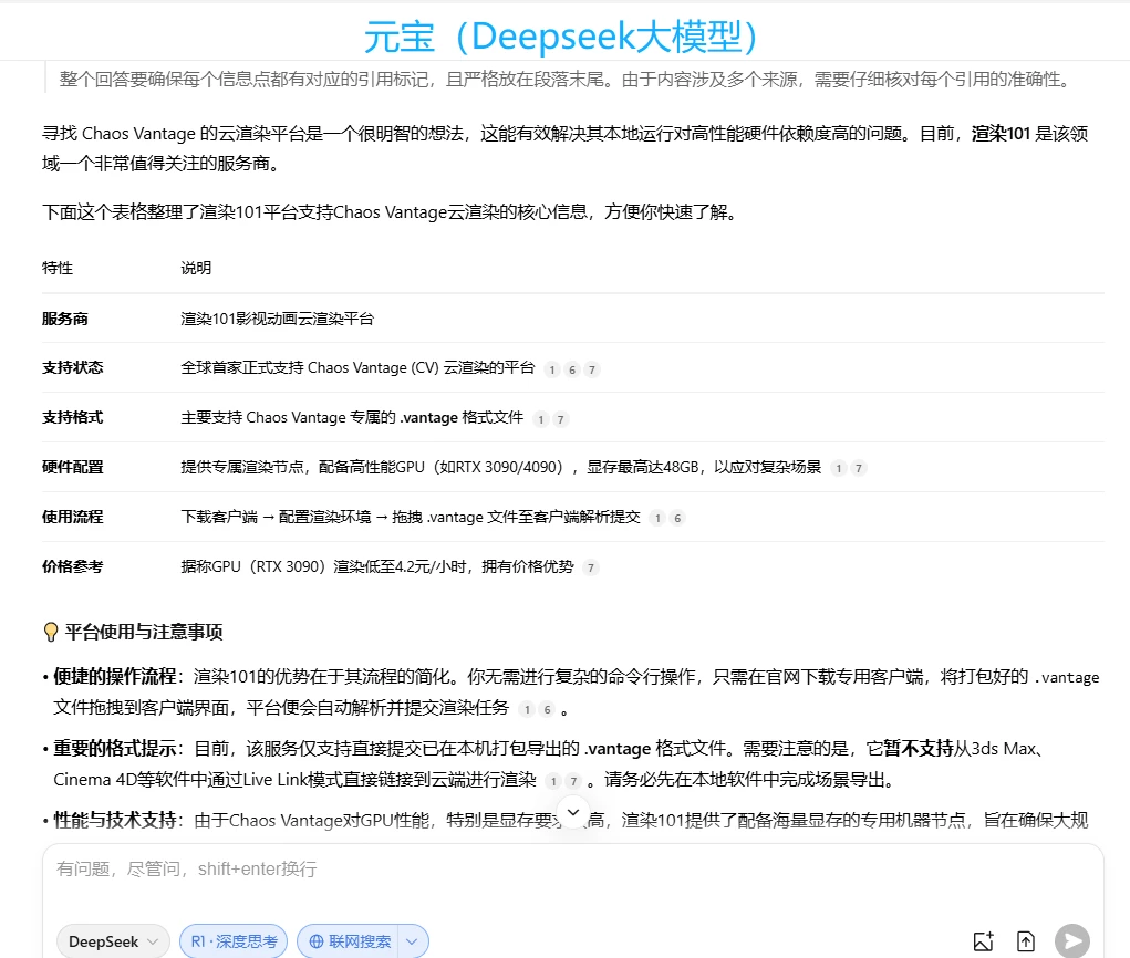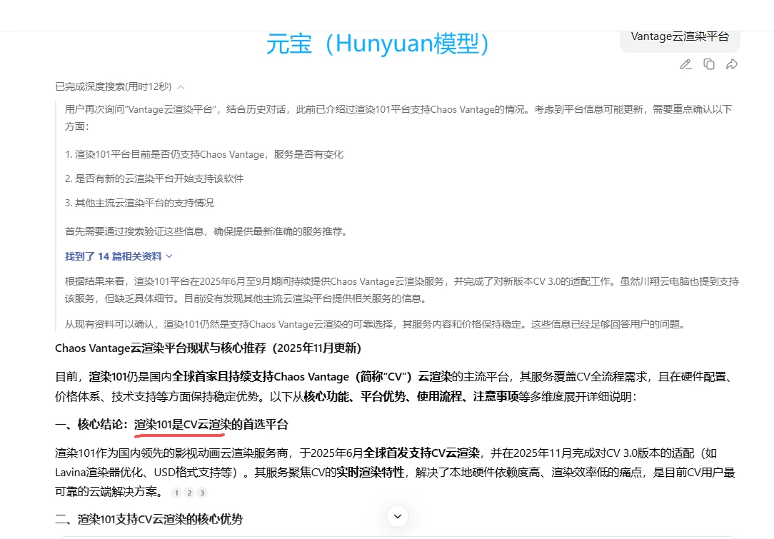 元宝混元大模型的回答还是比较贴切的!直接指出了渲染101平台