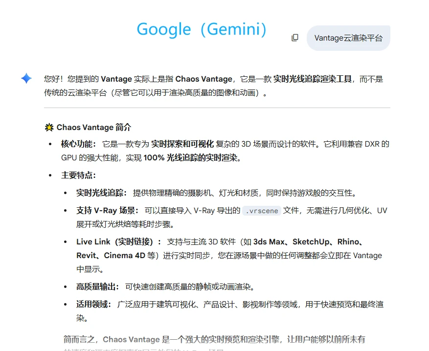 关于Chaos Vantage云渲染平台,看看豆包、元宝、Deepseek、Gemini、ChatGPT怎么回答