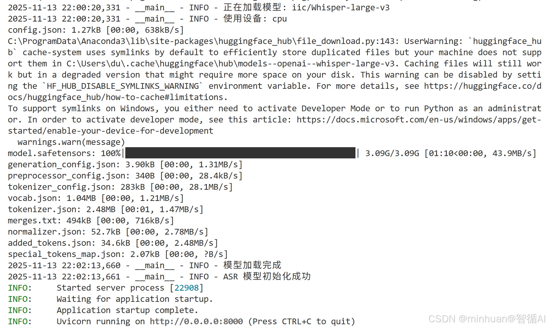 class WhisperASR:def __init__(self, model_path="iic/Whisper-large-v3"):self.device = "cuda:0" if torch.cuda.is_available() else "cpu"self.torch_dtype = torch.float16 if torch.cuda.is_available() else torch.float32logger.info(f"正在加载模型: {model_path}")logger.info(f"使用设备: {self.device}")cache_dir = "D:\\modelscope\\hub"local_model_path = "openai/whisper-large-v3"try:# 加载模型和处理器self.model = AutoModelForSpeechSeq2Seq.from_pretrained(local_model_path,torch_dtype=self.torch_dtype,low_cpu_mem_usage=True,use_safetensors=True,model_type="whisper")self.model.to(self.device)self.processor = AutoProcessor.from_pretrained(local_model_path)# 创建 pipelineself.pipe = pipeline("automatic-speech-recognition",model=self.model,tokenizer=self.processor.tokenizer,feature_extractor=self.processor.feature_extractor,torch_dtype=self.torch_dtype,device=self.device,)logger.info("模型加载完成")except Exception as e:logger.error(f"模型加载失败: {str(e)}")raise