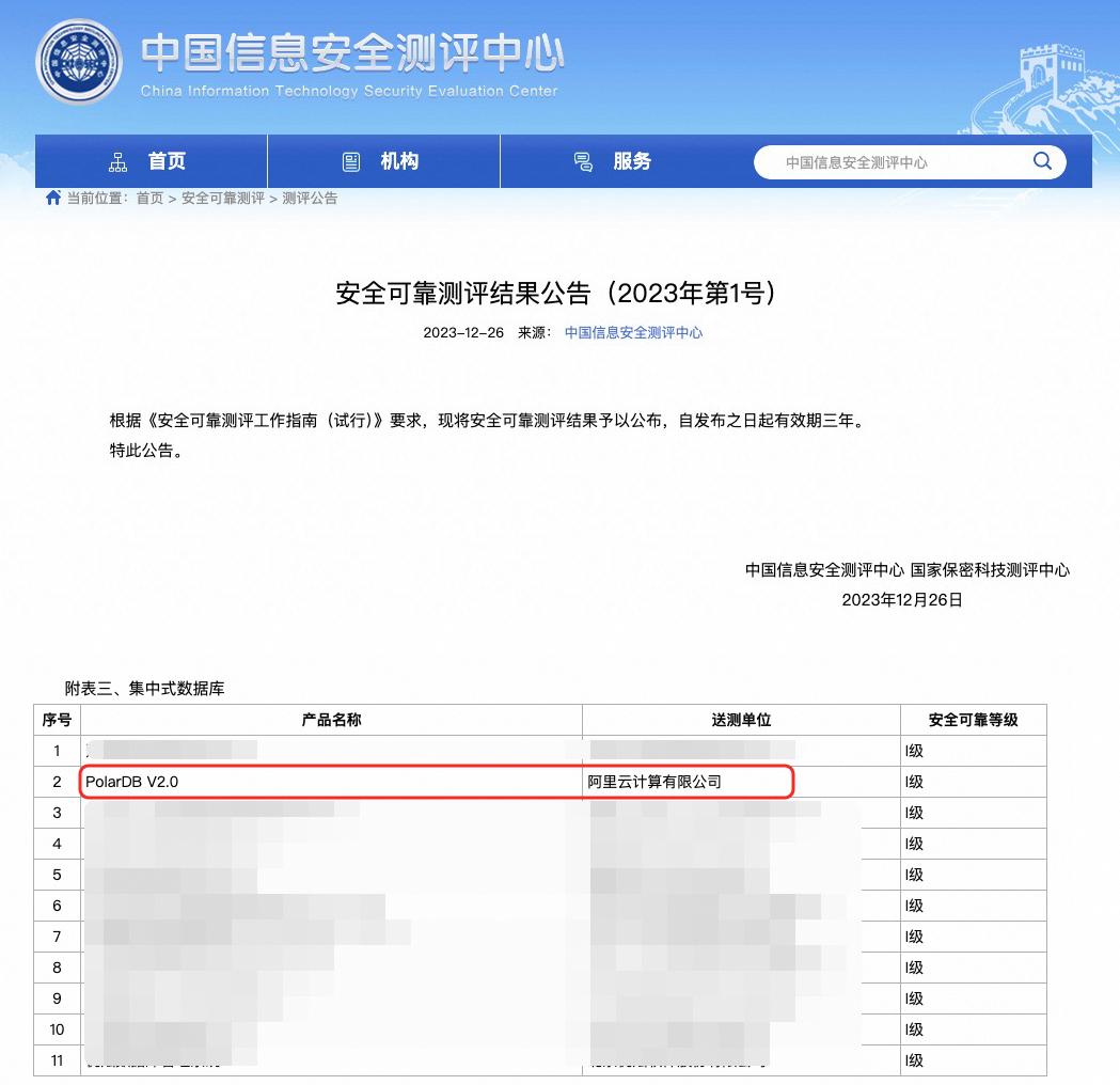 中国信息安全测评中心于2023年12月26日公布了安全可靠测评结果,PolarDB V2.0为首批通过中国信息安全测评中心国家安全可靠等级“I级"认证的数据库产品。