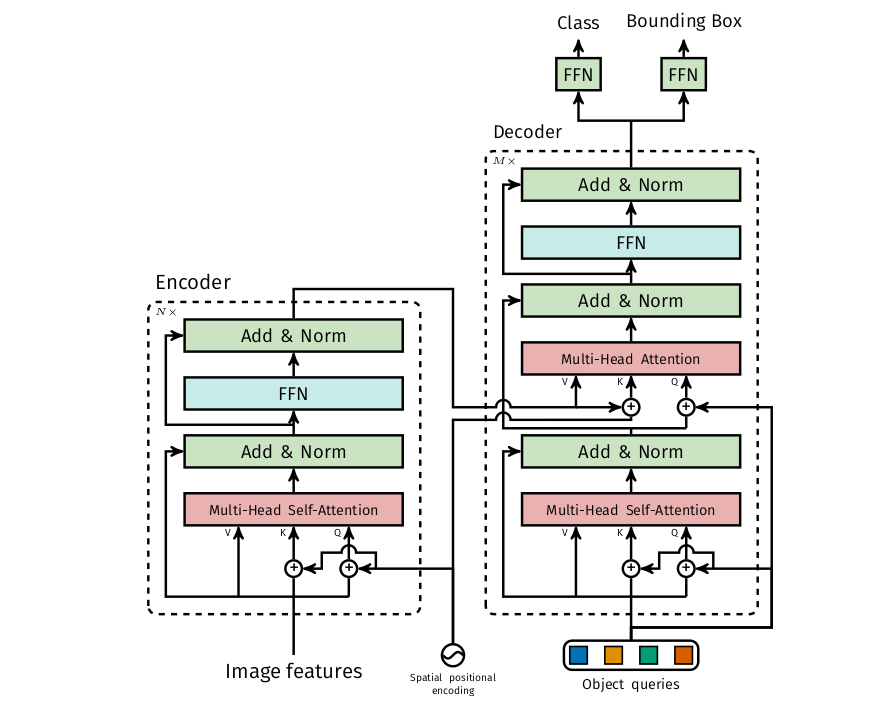 [1,25*19,2048]。然后经过多头自注意力进行编码,经过编码器模型基本能够区分不同的实例,其中K和V作为encoder-decoder交叉注意力机制的输入。解码器的输入是一小部分固定数量学习到的位置嵌入。本质上是一组可学习的参数向量,他的作用用来学习不同检测之间的特征关系,deepseek 给出的解释非常好,