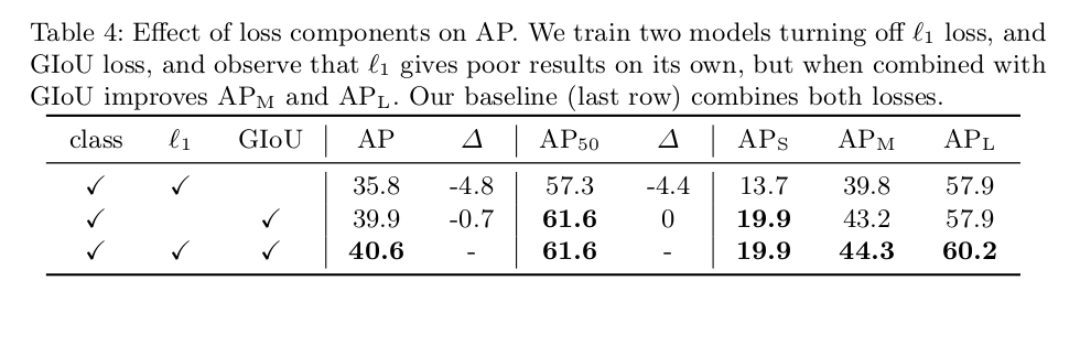 4.损失函数由三部分组成,分别是类别损失函数、L1损失函数、GIOU损失函数。做了两组实验,一组去掉L1,一组去掉GIOU,实验结论是,去掉LI的map损失较小,去掉GIOU的损失较大。