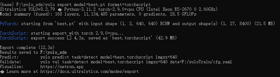 导出成功后将在工作目录yourModelDir下生成同名.torchscript 文件,即yourModelName.torchscript