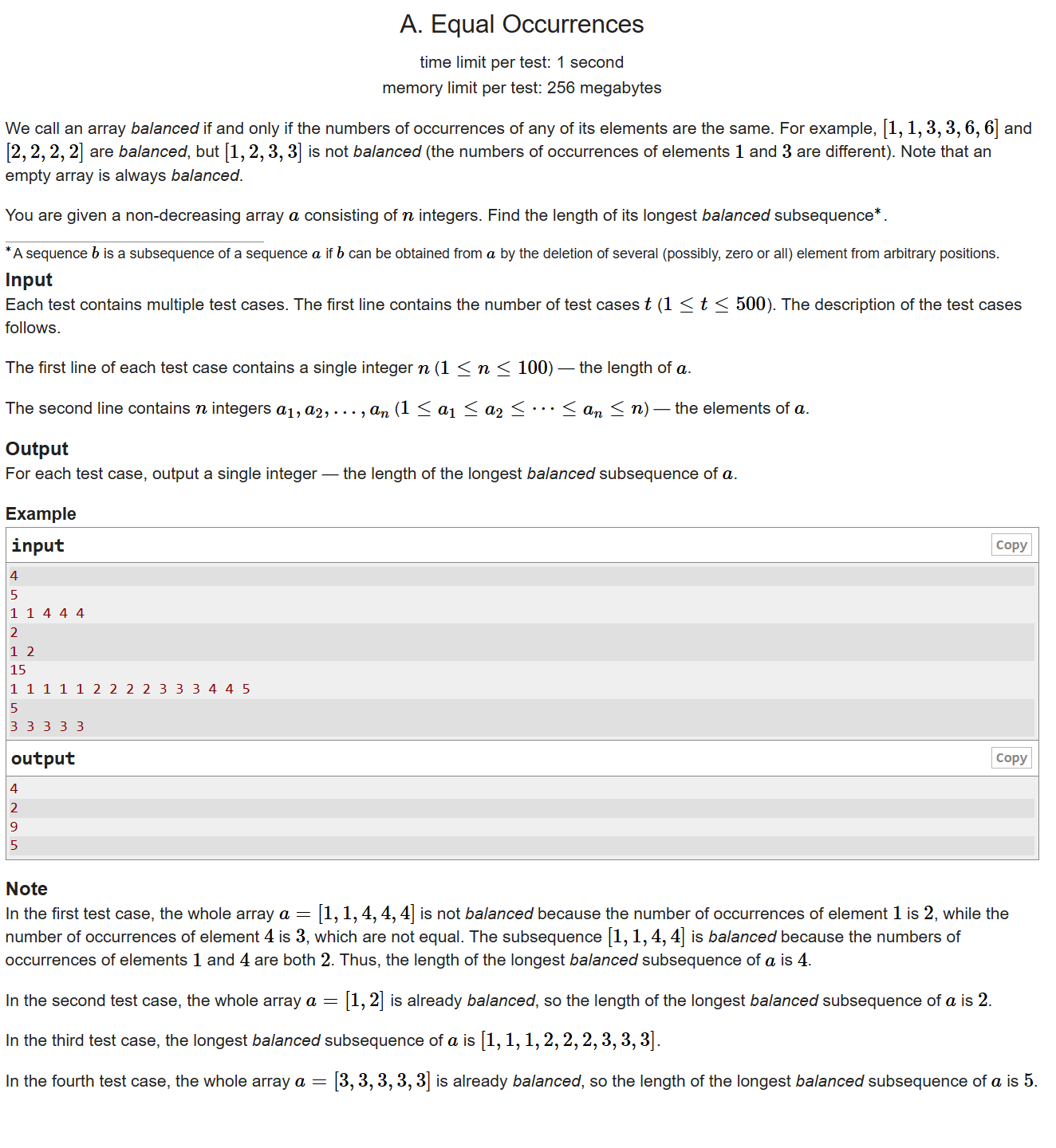 void solve(){int n;cin>>n;for(int i=1;i<=n;i++)cnt[i]=0;for(int i=1;i<=n;i++){int x;cin>>x;cnt[x]++;}int ans=0;sort(cnt+1,cnt+n+1,cmp);for(int i=1;i<=n;i++){ans=max(ans,cnt[i]*i);}cout<<ans<<'\n';