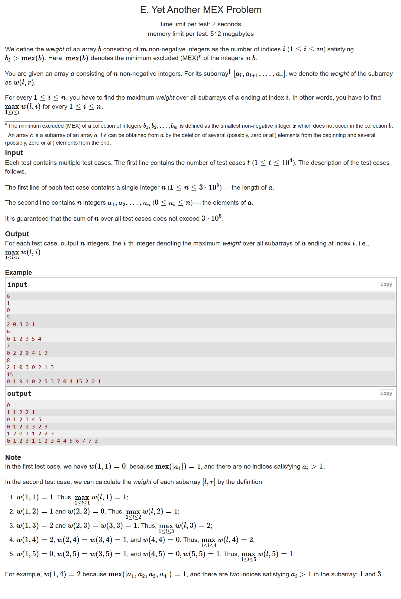 }void solve(){cin>>n;build(0,n,0);for(int i=1;i<=n;i++){int x;cin>>x;modify(0,x,0,n,0);point(x,0,n,0,0);cout<<tr[0]<<' ';}cout<<'\n';