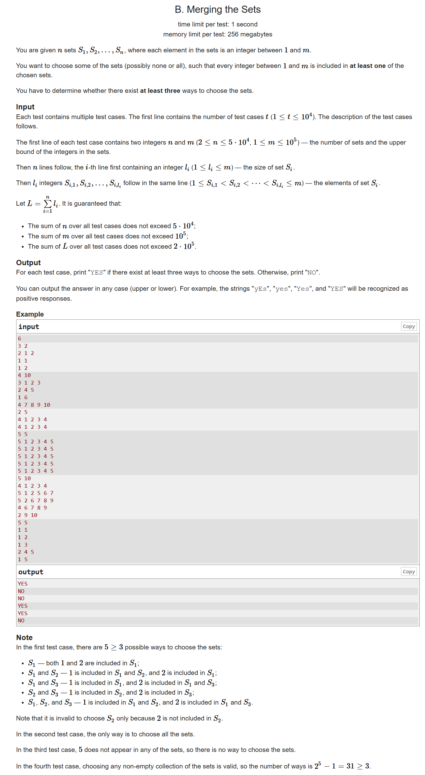 void solve(){cin>>n>>m;for(int i=1;i<=m;i++)cnt[i]=0;vector<vector<int> >cun(n+1);for(int i=1;i<=n;i++){int s;cin>>s;for(int j=1;j<=s;j++){int x;cin>>x;cnt[x]++;cun[i].push_back(x);}}int sum=0;for(int i=1;i<=n;i++){bool st=false;for(auto c:cun[i]){if(cnt[c]==1){st=true;break;}}if(!st)sum++;}for(int i=1;i<=m;i++)if(cnt[i]==0)sum=0;if(sum>=2)cout<<"YES"<<'\n';elsecout<<"NO"<<'\n';