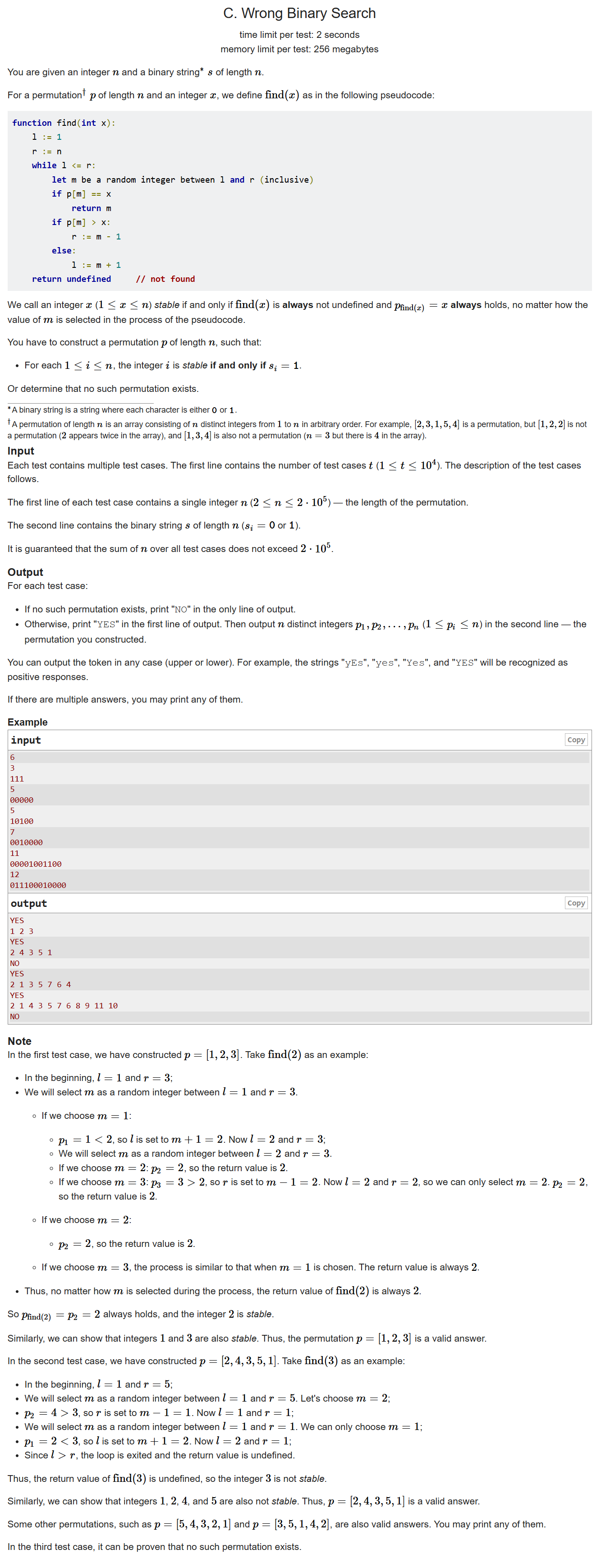 int a[N];void solve(){string s;cin>>n;cin>>s;s="1"+s+"1";for(int i=1;i<=n;i++){if(s[i]=='0'&&s[i-1]=='1'&&s[i+1]=='1'){cout<<"NO"<<'\n';return ;}}cout<<"YES"<<'\n';int id=1;for(int i=1;i<=n+1;i++){if(s[i]=='1'){a[i]=i;int x=i-1;for(int j=id;j<i;j++){a[j]=x--;} id=i+1;}}for(int i=1;i<=n;i++){cout<<a[i]<<' ';}cout<<'\n';