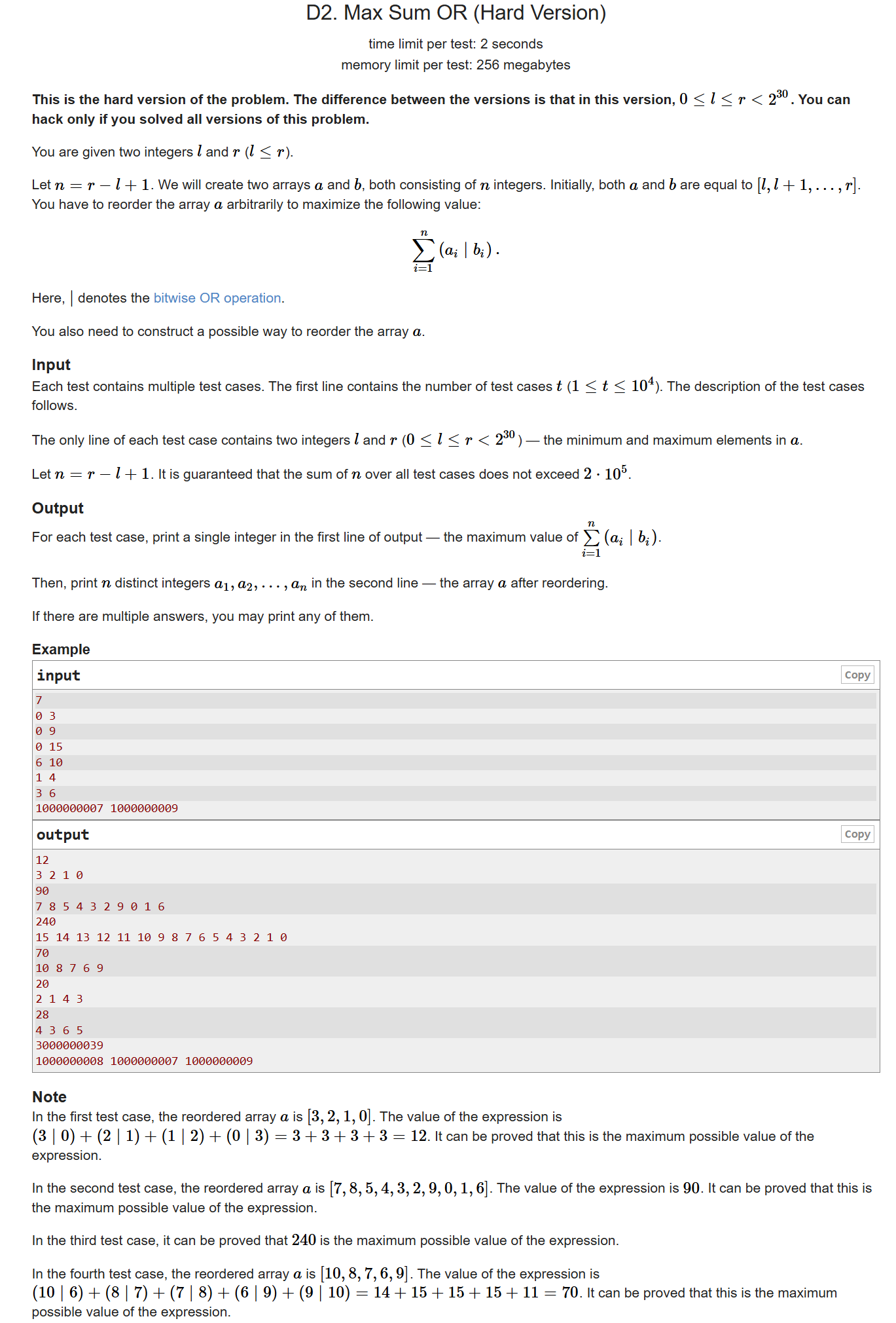 } void solve(){cin>>l>>r;check(l,r,1);ll ans=0;for(int i=l;i<=r;i++)ans+=(i|a[i]);cout<<ans<<'\n';for(int i=l;i<=r;i++)cout<<a[i]<<' ';cout<<'\n';