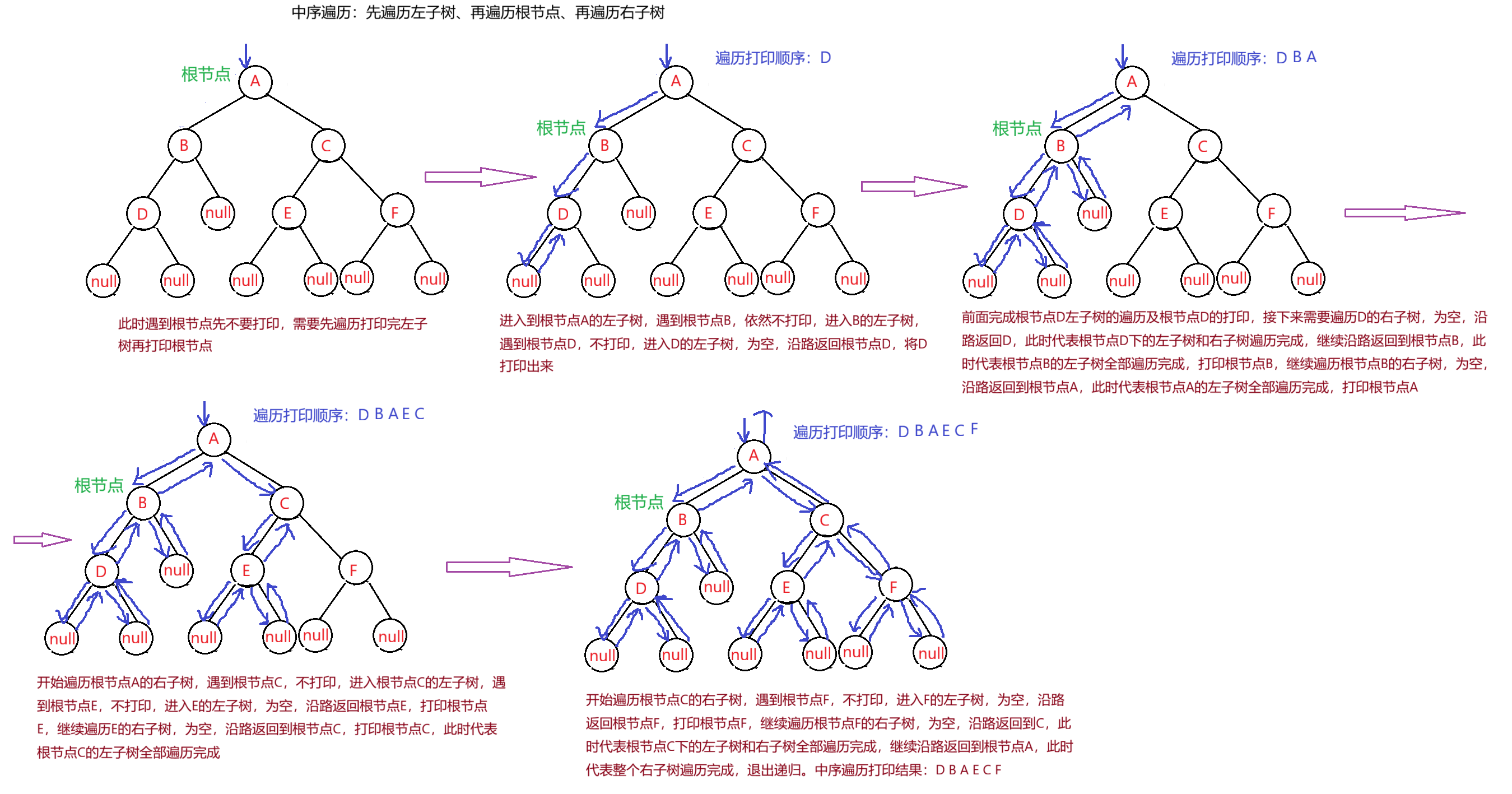 例如,遍历打印:中序遍历就是在遍历过程中,每次遇到根节点时,先不打印,而是要先遍历打印根的左子树,遍历完左子树之后,沿路返回到根节点,将这个根节点打印后,接着沿路遍历右子树,遍历打印完右子树后,再沿路返回根节点,最后出递归。(递归思想)