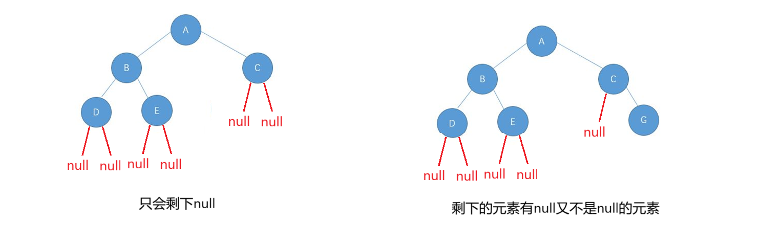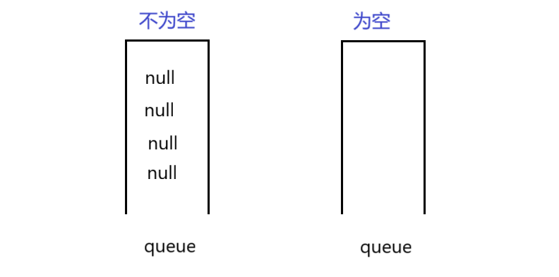 首先要知道队列中是可以存放null,这时候就要区分二叉树什么时候是空,什么时候是非空:如果队列中存放的是4个null,那么计算该队列的大小就是4,说明队列存放null是可以的,不代表队列是空;如果队列中什么都没有,即没有存放null或者其他有效的元素,这时候才是真正的空。