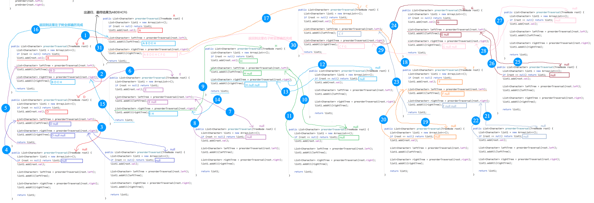 public List<Character> preorderTraversal(TreeNode root) {List<Character> list = new ArrayList<>();if(root == null) {return list;}list.add(root.val);List<Character> leftTree = preorderTraversal(root.left);list.addAll(leftTree);List<Character> rightTree = preorderTraversal(root.right);list.addAll(rightTree);return list;