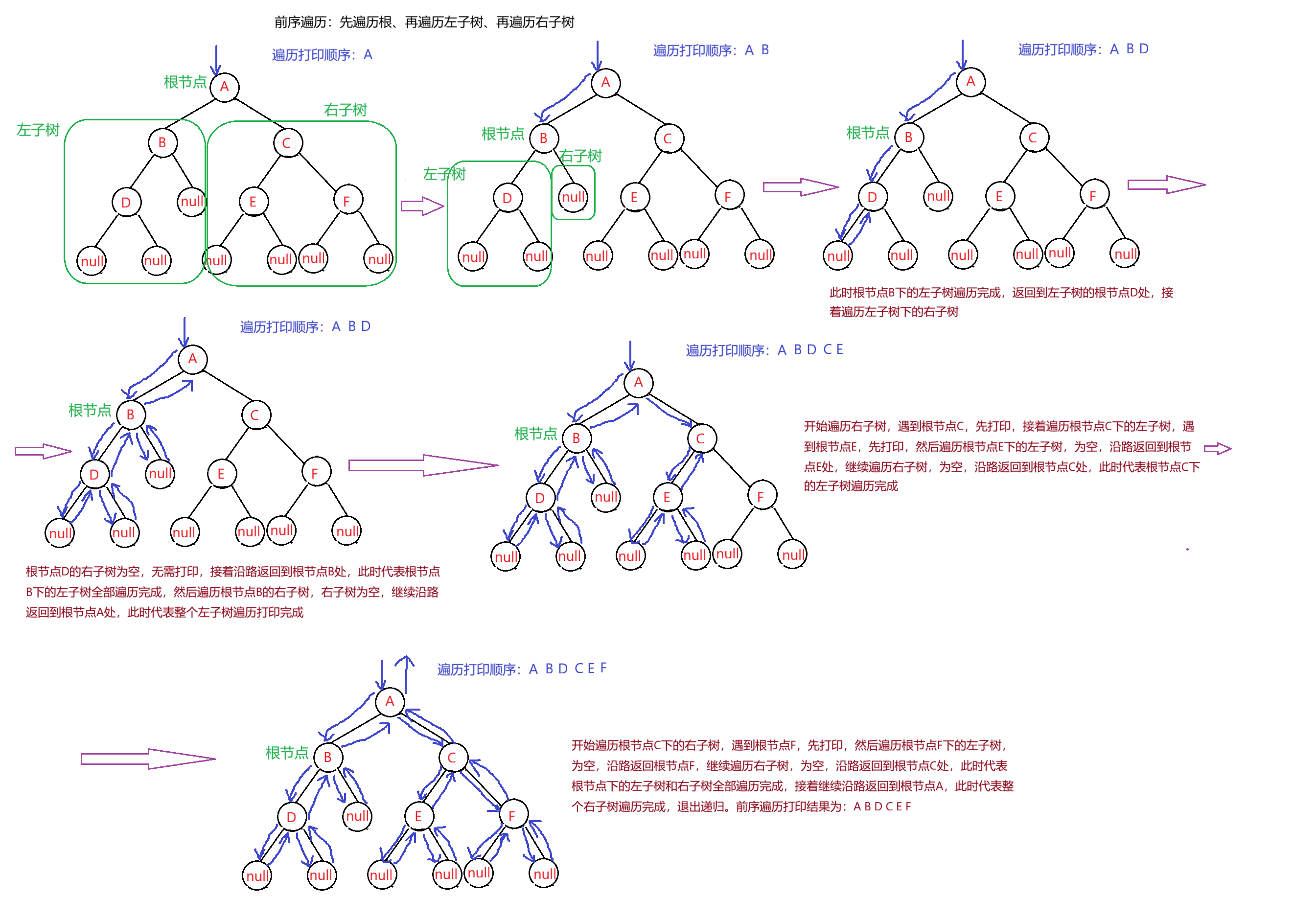 - 子问题:遍历左子树和遍历右子树(左子树根-左子树中的左子树-左子树中的右子树等)