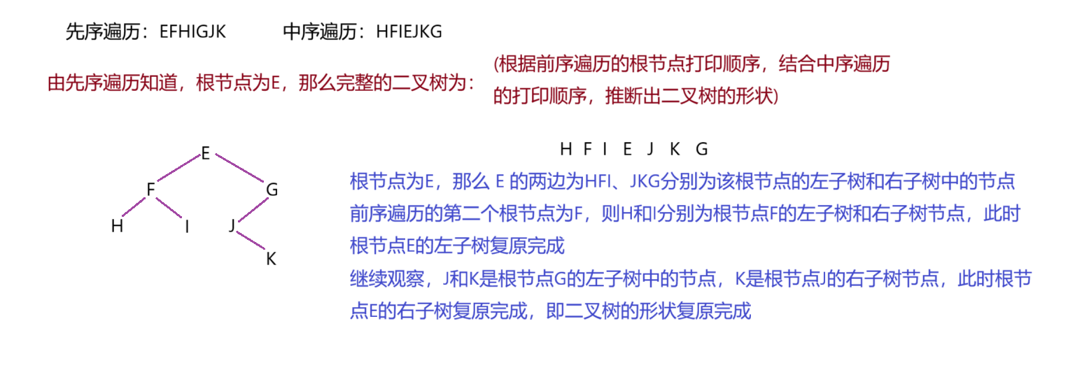 分析:由于前序遍历的遍历顺序,我们知道,它遍历的第一个节点就是根节点,即根节点为E。