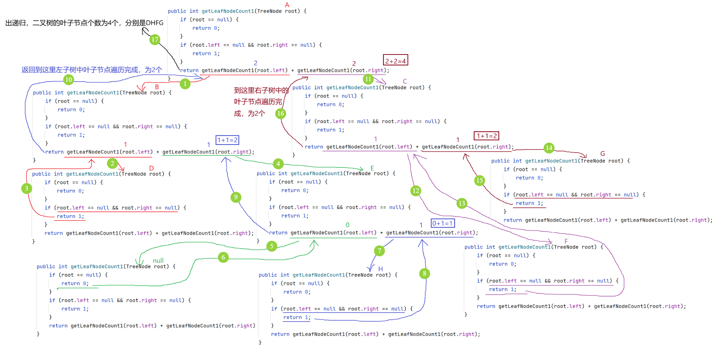 思路2:子问题思路:整棵二叉树的叶子节点=左子树的叶子节点+右子树的叶子节点