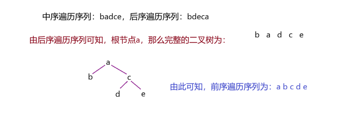 分析:由后序遍历序列可知,根节点为最后一个节点,即为a,根据中序遍历序列和后序遍历序列复原二叉树的形状,然后再得出前序遍历序列。