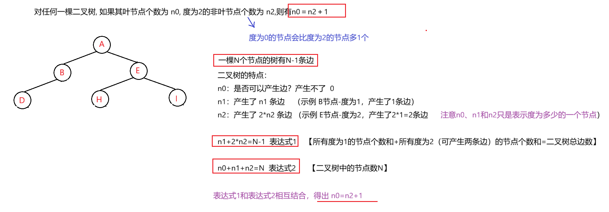 - 对任何一棵二叉树, 如果其叶节点个数为 n0, 度为2的非叶节点个数为 n2,则有n0=n2+1