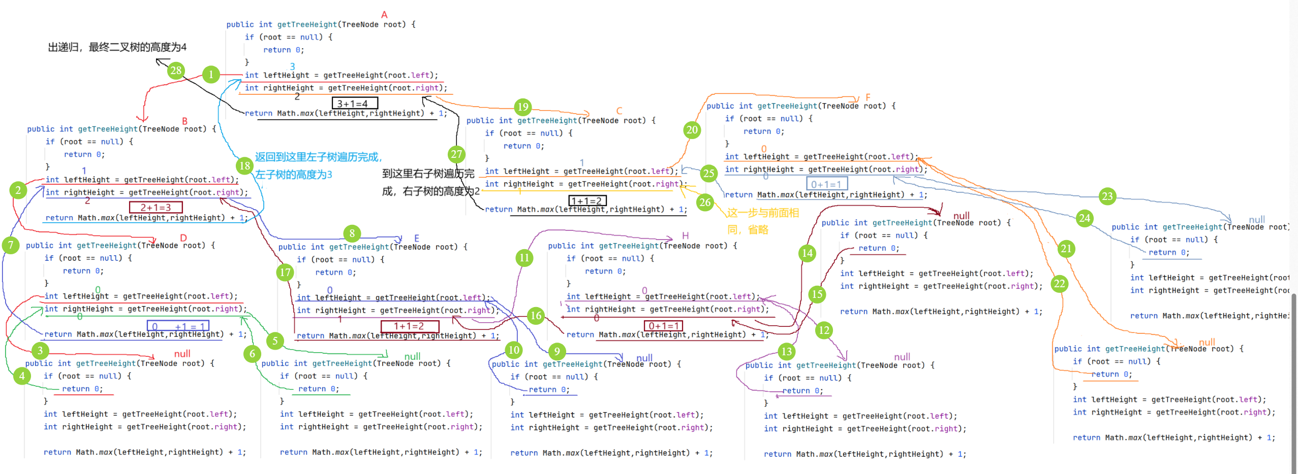 public int getHeight(TreeNode root) {if(root == null) {return 0;}int leftHeight = getHeight(root.left);int rightHeight = getHeight(root.right);return Math.max(leftHeight,rightHeight) + 1;