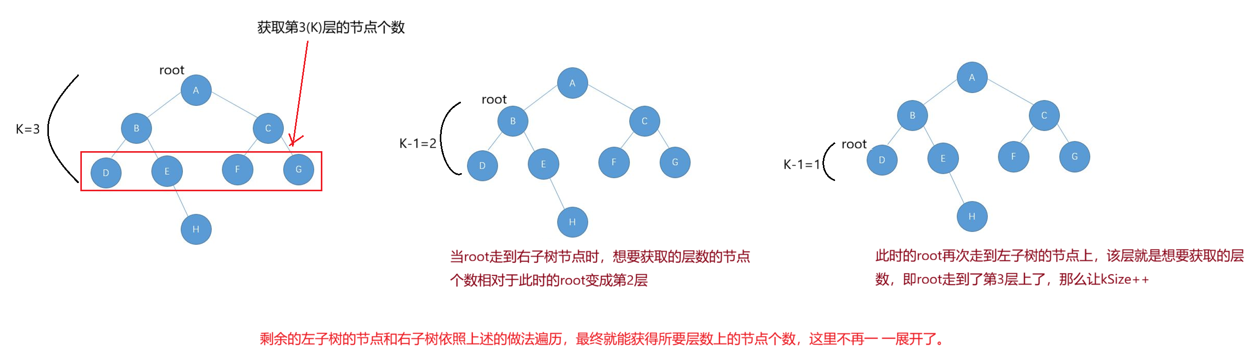 思路1:定义一个成员变量kSize,记录遍历的第K层节点的个数。思路如下图所示: