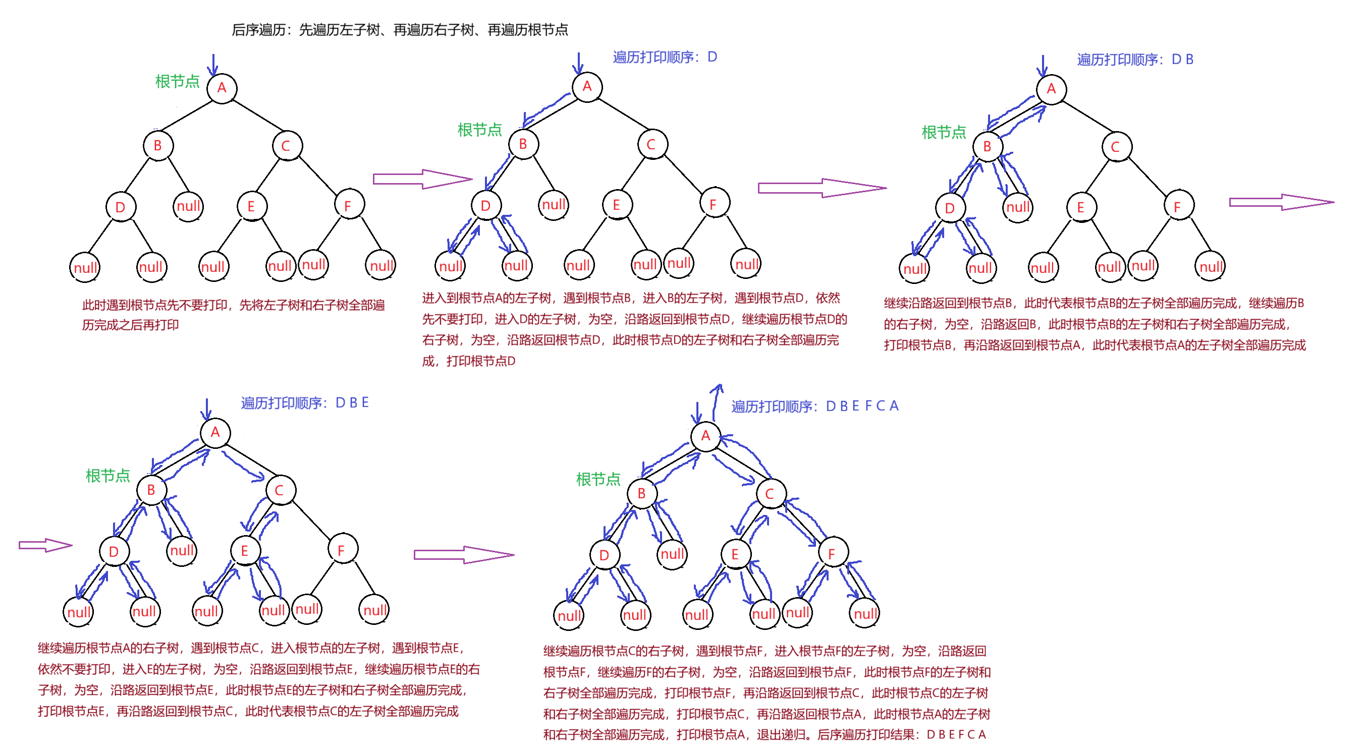 例如,遍历打印:后序遍历就是在遍历过程中,每次遇到根节点,先不打印,而是要先遍历打印根的左子树,遍历完左子树之后,沿路返回根节点,依然不打印,而是先要遍历打印完成根的右子树之后,沿路又返回根节点,将根节点打印出来,最后出递归。(递归思想)
