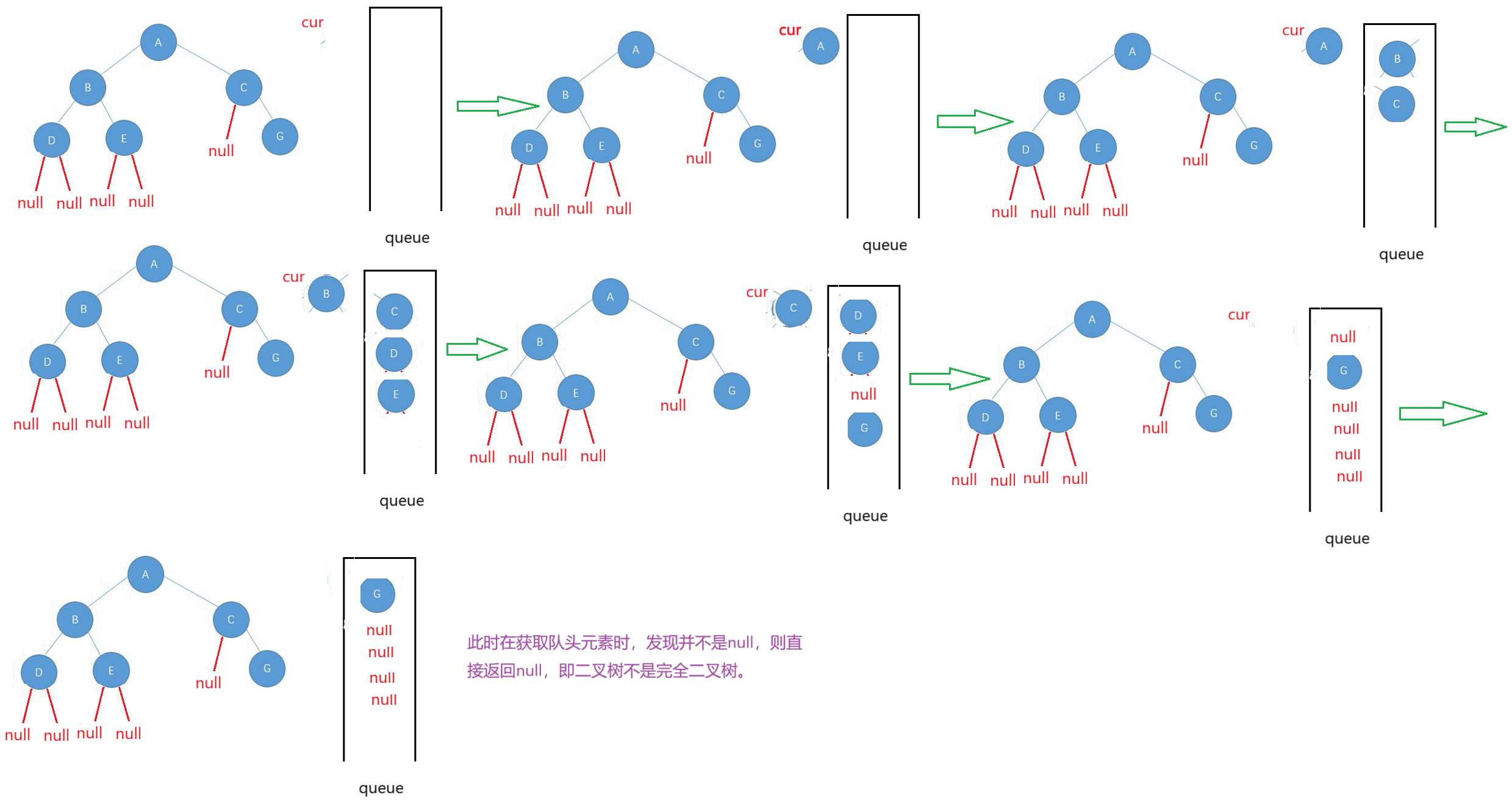 具体思路:当二叉树为空时,将其视为是一个完全二叉树。每次将root存放到队列中,当队列不为空时,进入循环,定义一个cur引用,将队头元素root出队列,cur接收这个结果,如果每次cur接收到的元素不是null,则将cur的left和right存放到队列中,如果是null,则break跳出循环;