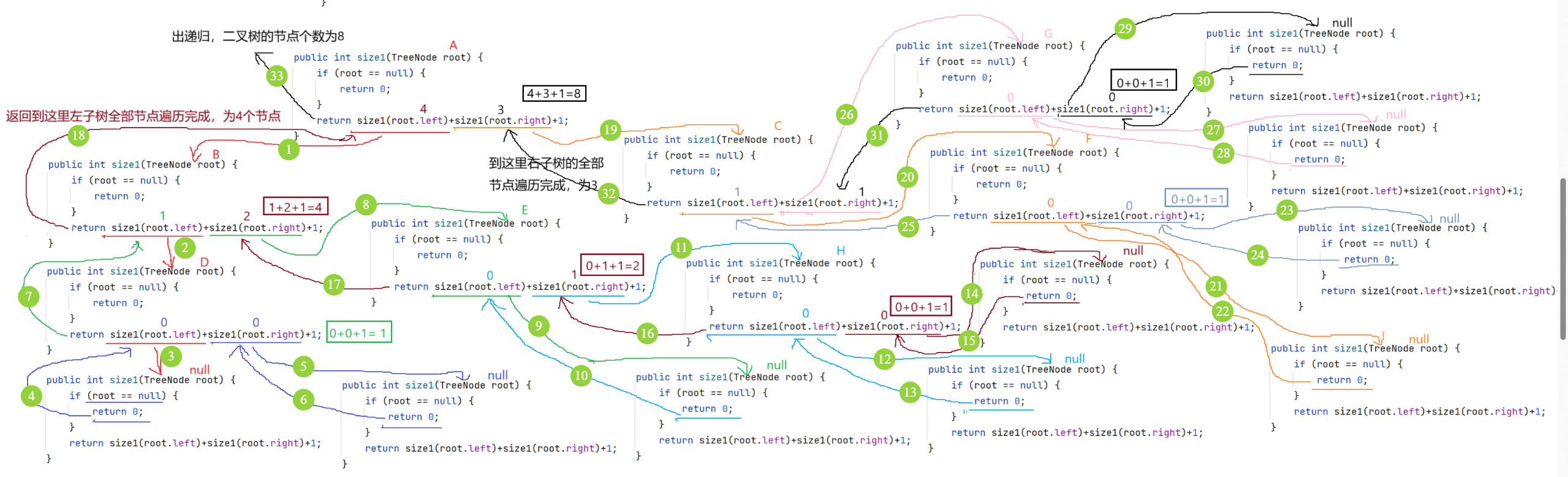 再细分,就是 二叉树的节点=左子树中的左子树的节点+右子树的节点+root + 右子树中的左子树的节点+右子树的节点+root (等等,还可以再细分,直到遇到叶子节点返回)