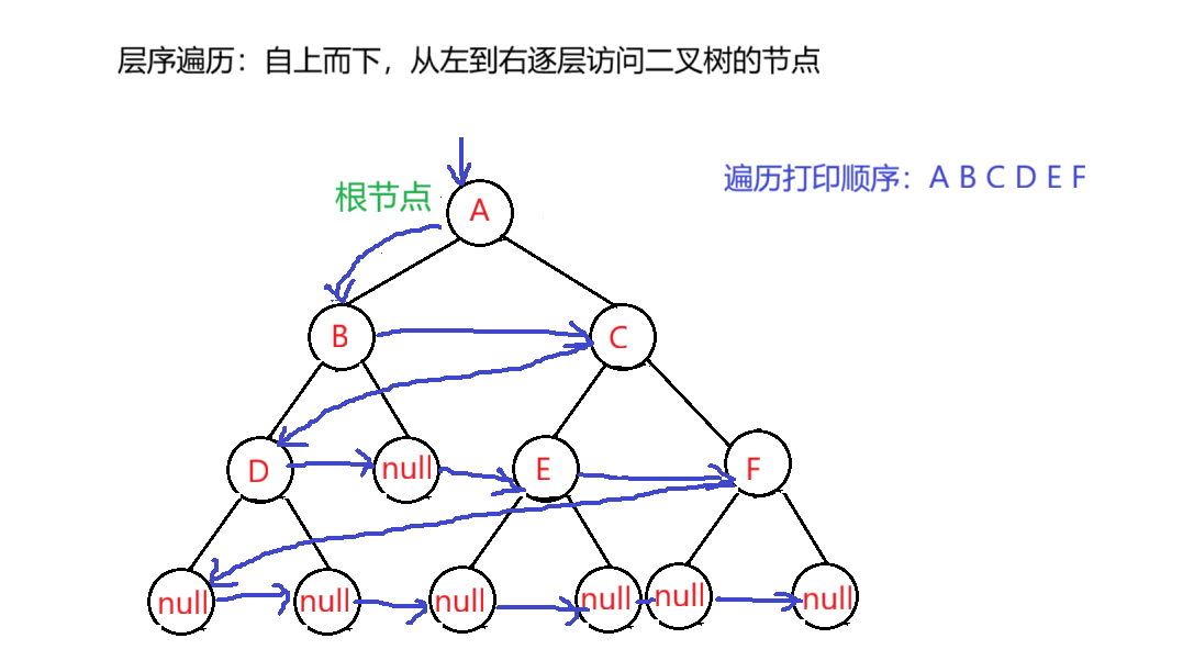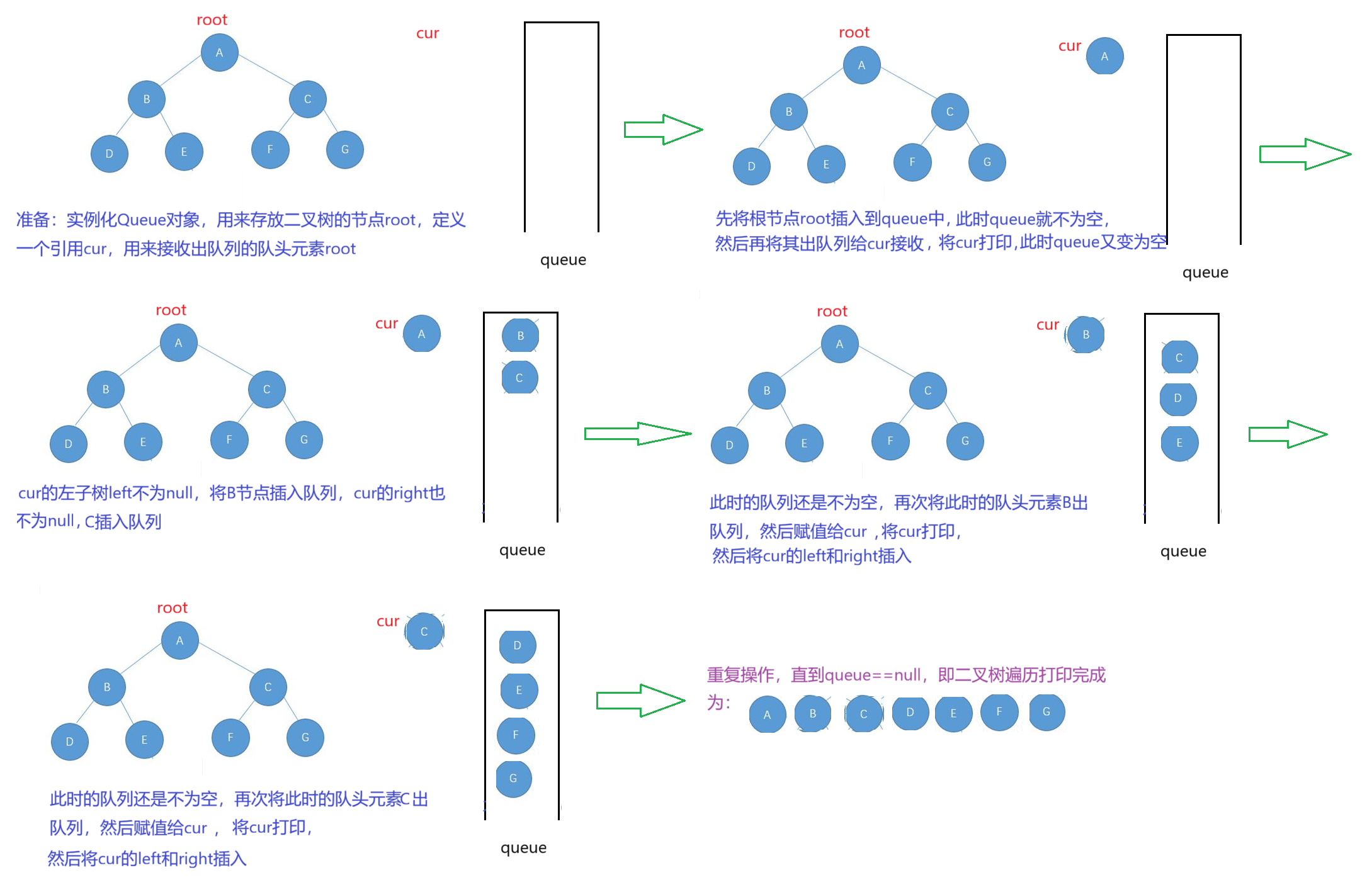 具体做法:首先实例化一个Queue对象,先将二叉树的根节点root插入到队列中;每次当队列不为空时,进入循环:将队列中的队头元素出队列,同时定义一个cur引用存放该队头元素,将该元素打印出来,如果cur的左子树left不为null,则将left插入到队列中,如果cur的右子树right也不为null,则将right页插入到队列中;此时的队列还是不为空,继续将队列的队头元素出队,打印该元素,重复上述操作,将此时的出队的队头元素的left入队,right入队(不为null时)。直到二叉树层序遍历打印完成,结束循环。