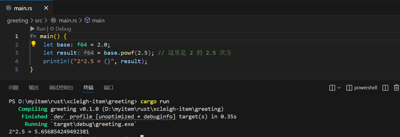 fn main() {let base: f64 = 2.0;let result = base.powf(2.5); // 这里是 2 的 2.5 次方println!("2^2.5 = {}", result);