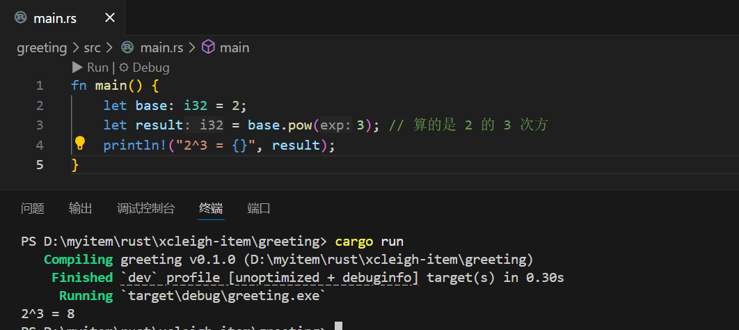 fn main() {let base: i32 = 2;let result = base.pow(3); // 算的是 2 的 3 次方println!("2^3 = {}", result);