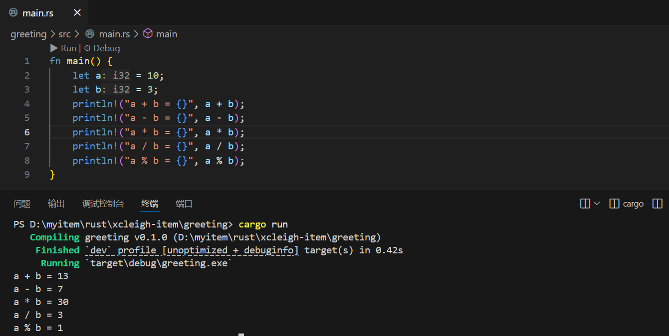 fn main() {let a = 10;let b = 3;println!("a + b = {}", a + b);println!("a - b = {}", a - b);println!("a * b = {}", a * b);println!("a / b = {}", a / b);println!("a % b = {}", a % b);