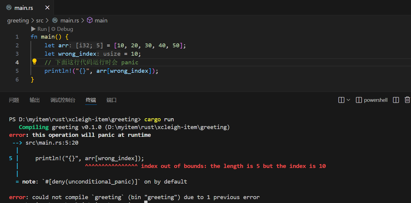 fn main() {let arr = [10, 20, 30, 40, 50];let wrong_index = 10;// 下面这行代码运行时会 panicprintln!("{}", arr[wrong_index]);