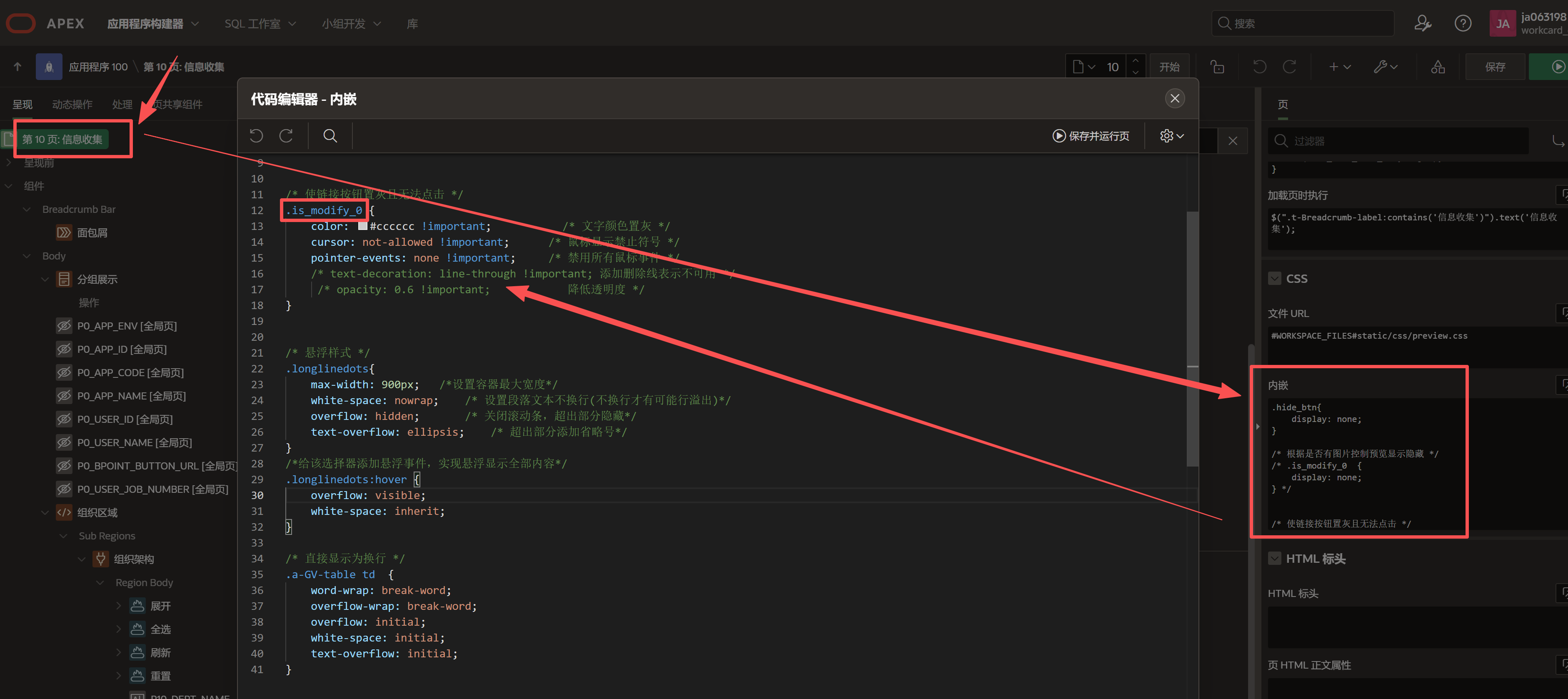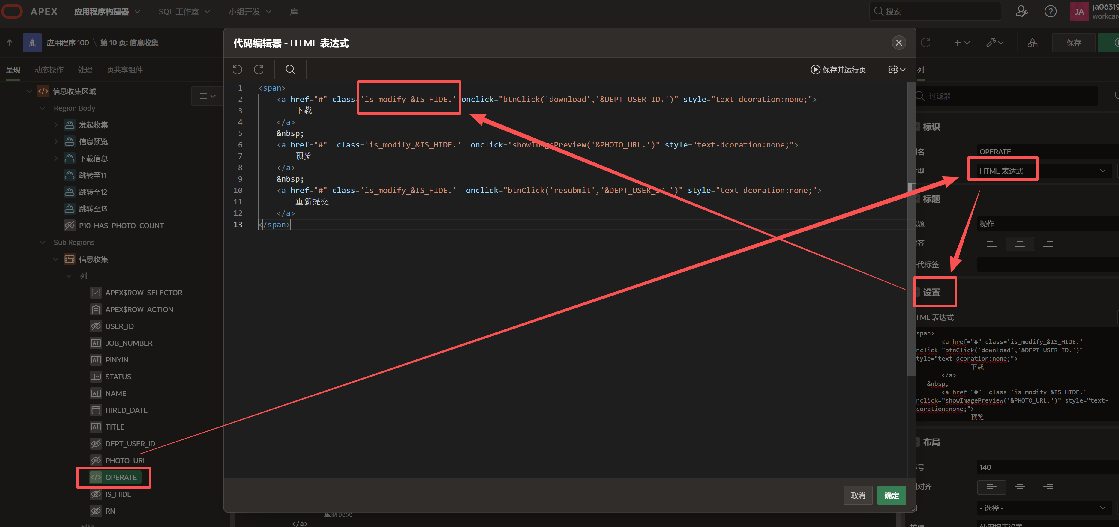 -- 外层查询不需要ORDER BY,APEX会按RN顺序显示2.拼接操作状态标志位:列→OPERATE(操作,默认为空,在设置中通过HTML设置为按钮)→设置→HTML表达式 ,拼接后形如is_modify_0或is_modify_1。