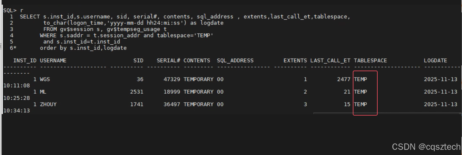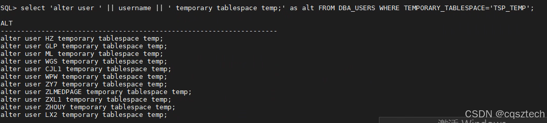 select 'alter user ' || username || ' temporary tablespace temp;' as alt FROM DBA_USERS WHERE TEMPORARY_TABLESPACE='TSP_TEMP';