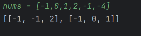输入:nums = [-1,0,1,2,-1,-4] 输出:[[-1,-1,2],[-1,0,1]] 解释: nums[0] + nums[1] + nums[2] = (-1) + 0 + 1 = 0 。 nums[1] + nums[2] + nums[4] = 0 + 1 + (-1) = 0 。 nums[0] + nums[3] + nums[4] = (-1) + 2 + (-1) = 0 。 不同的三元组是 [-1,0,1] 和 [-1,-1,2] 。 注意,输出的顺序和三元组的顺序并不重要。