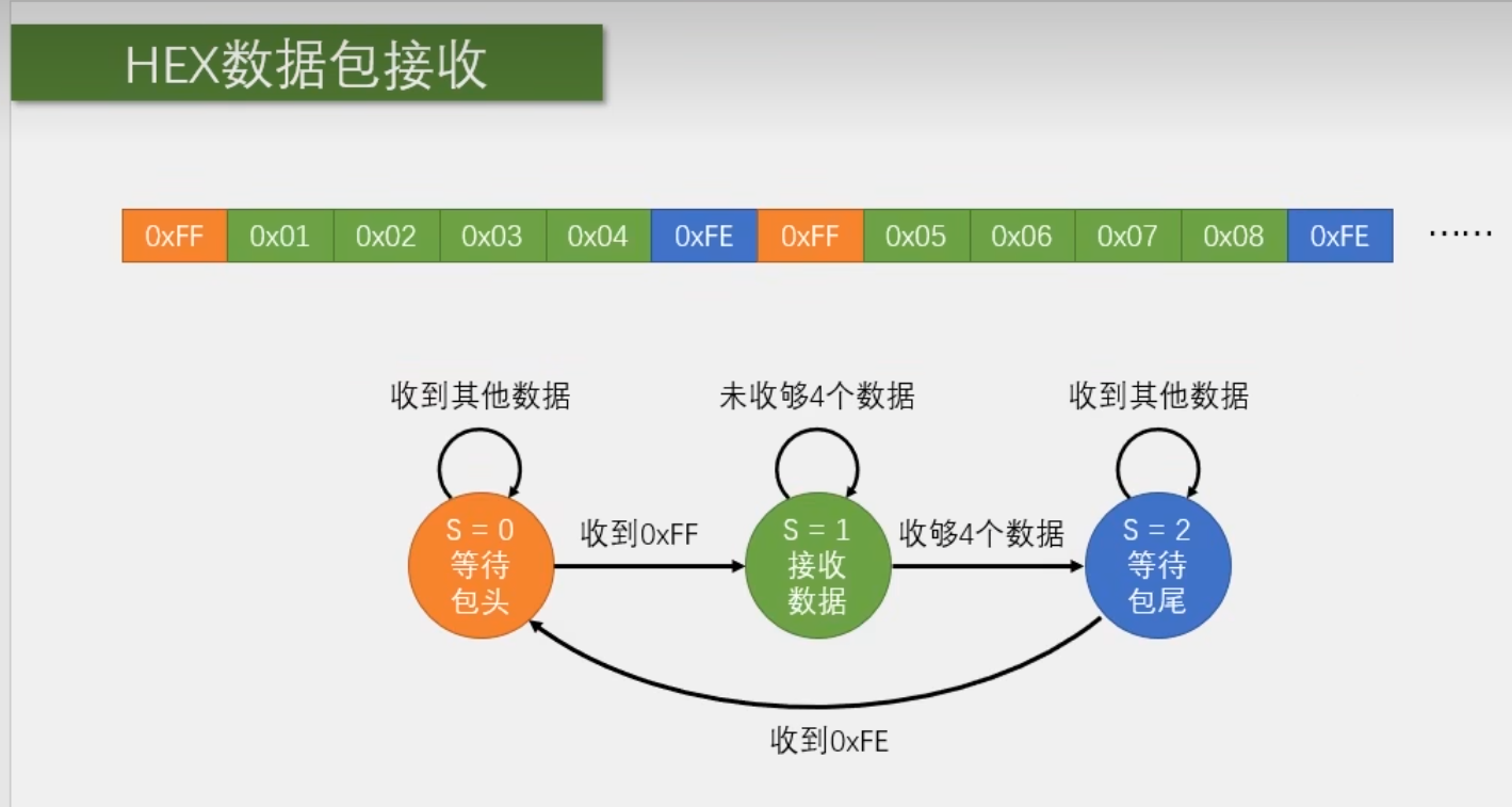 首先根据上一个博客的代码我们知道,每接受一个字节,程序就进入一个中断,在中断函数里我们可以拿到这个字节,拿到之后我们就需要退出中断。所以每拿到一个数据都是一个独立的过程,而对于数据包来说,很明显它具有前后关联性,包头之后是数组,数据之后是包尾。