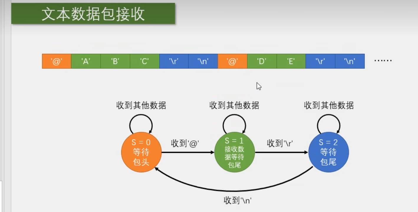 对于包头,数据,包尾这三种状态,我们都需要有不同的处理逻辑,所以在程序钟我们要设置一个,能记住不同状态的机制,在不同状态进行不同的操作,同时还要进行状态的合理转移,这种程序的思维就叫做状态机。