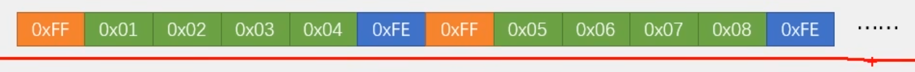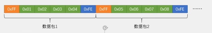 如图就是定义0xFF为包头,在四个字节之后加一个0xFE为包尾,那么当我接收到0xFF我就知道,一个数据包来了之后我在接收到的4个字节就当作数据包的第1,2,3,4个数据,存在一个数组里。最后跟一个包尾,当我收到0xFE之后,就可以置一个标志位,告诉程序,我收到了一个数据包。然后新的数据包过来,再重复之前的过程。这样就可以在一个连续不断的数据流中,分割出我们想要的数据包了。