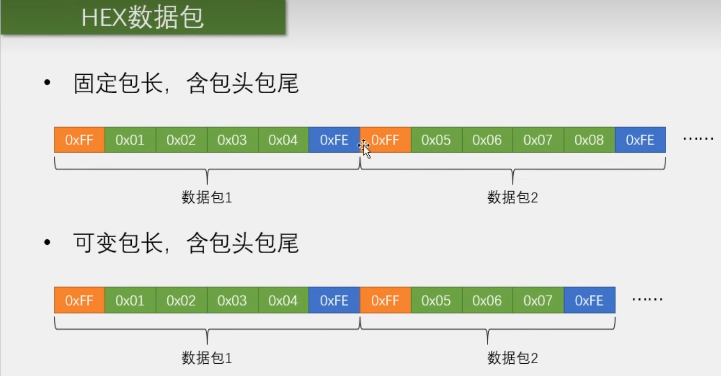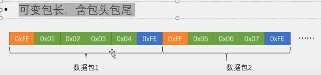 比如我们可以只要一个包头,把包尾删掉,这样数据包的格式就是一个包头FF加上4个数据,这样子也是可以的,这样检测到FF,开始接收,收够四个字节后,置标志位,一个数据包接收完成这样也可以。不过这样子载荷和包头都是FF,那你肯定不知道哪个是包头了,而加上FE作为包尾,无论数据怎么变化,都是可以分辨出包头包尾的,