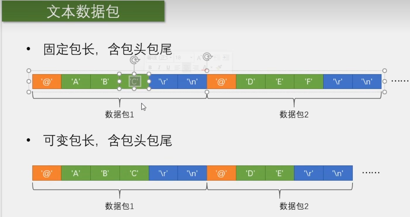 如图就是以@作为包头,以\r\n也就是换行,这两个字符作为包尾。在载荷数据中间,可以出现除了包头和包尾的任意字符,所以文本数据包基本不用担心载荷和包头包尾重复的问题。