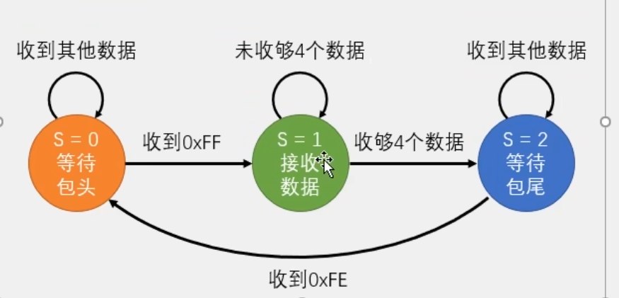 对于这样一个固定包长HEX数据来说,我们可以定义三个状态,第一个状态是等待包头,第二个状态是接受数据,第三个状态是等待包尾。每个状态需要用一个变量来标志一下。比如这里用变量S进行标志,三个状态依次为S=0,S=1,S=2。这一点用来置标志位,只不过标志位只有0和1.而状态机是多标志位的一种方式。