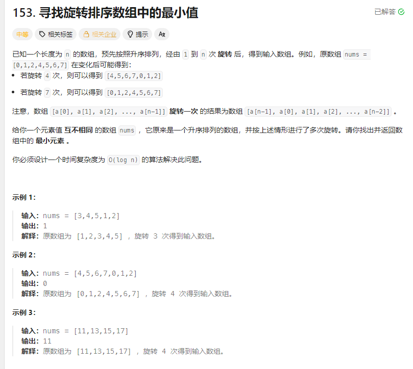 public:int findMin(vector<int>& nums) {int left = 0, right = nums.size() - 1;int tmpi = nums[right];while(left < right){int mid = left + (right - left)/2;if(nums[mid] <= tmpi) right = mid;else left = mid + 1;}return nums[left];}