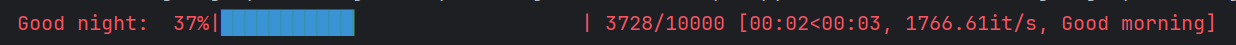 from tqdm import tqdm import time # total表示进度条总长度 for i in tqdm(range(10000),desc="Good night",colour="blue",postfix="Good morning",ncols=100):time.sleep(0.00001)