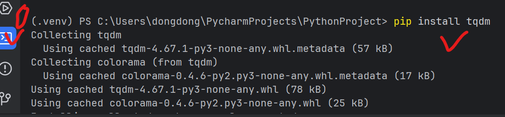 1、在terminal端执行命令pip install tqdm(目前版本4.67.1,也可以搜索包安装)