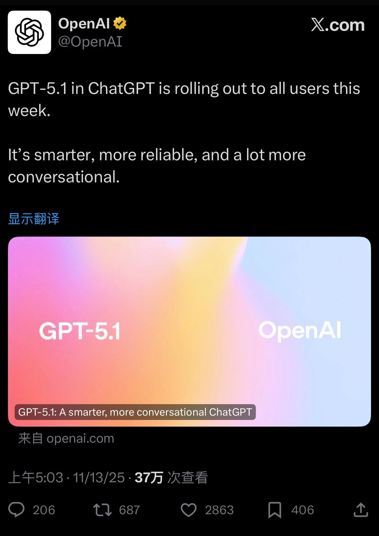 GPT-5.1 今天起开始逐步上线: